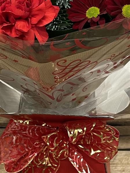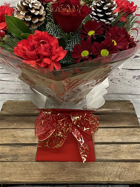A very festive hand tied of seasonal red flowers nestled among a selection of scented spruce and pine. A lovely gift to brighten any table.