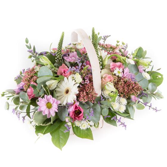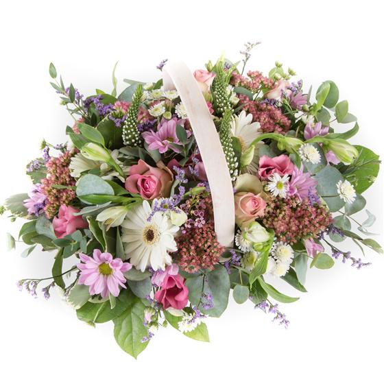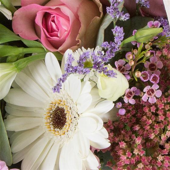 A pastel collection of dainty blooms in pinks, whites and lilacs, including Roses, Limonium and lisianthus.