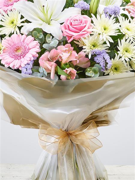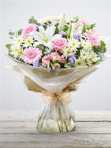 A stunning and popular bouquet featuring pastel pink, white, and lilac flowers including Roses and Alstromeria.