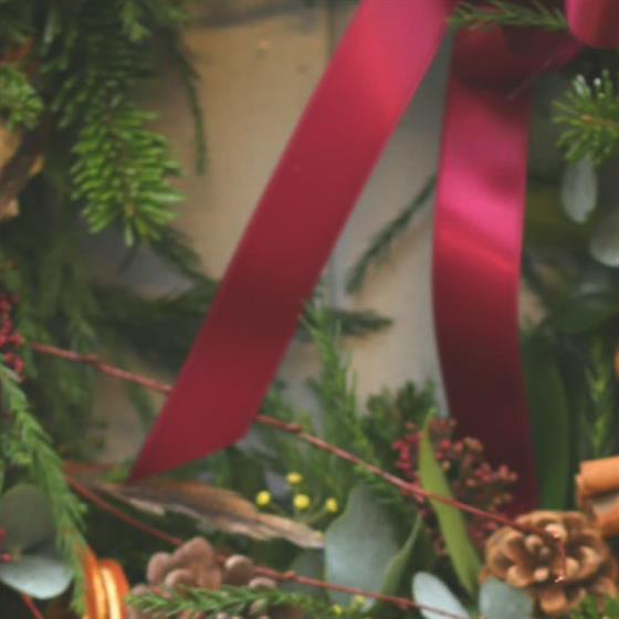 A fresh, festive wreath created using seasonal foliage, cones, dried orange slices and scented cinnamon.