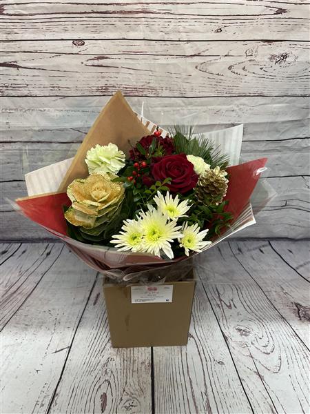 A delightful selection of Christmassy blooms. Hand tied with a selection of scented pine.