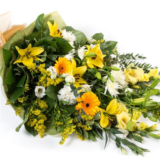 A natural tied sheaf of yellow white blooms, including Lilies and Germini.