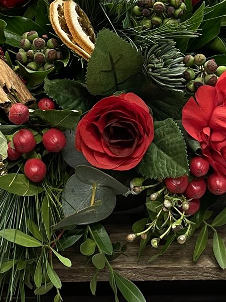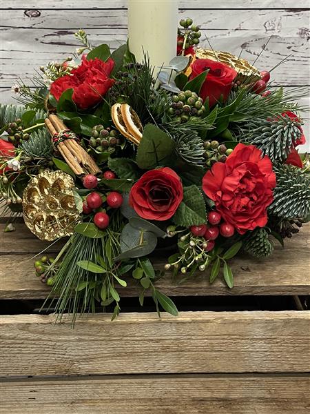 A wonderful candle arrangement with scented Pines, Fruit slices and cinnamon along with a mix of flowers including beautiful Roses. A luxurious addition to any table.