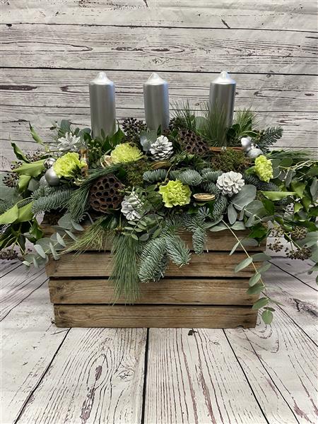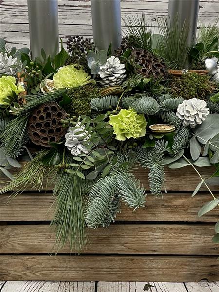 Luxurious arrangement suitable for a mantle, dresser or console table. Slightly trailing with 3 large candles. Includes mixed Pines, lush foliage and long lasting flowers with beautifully scented dried fruits and cones.