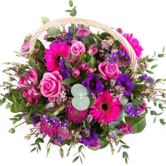 A colourful arrangement of cerise pinks and purples, including Roses, mini Gerbera and Alstromeria.