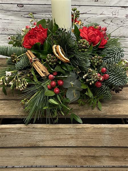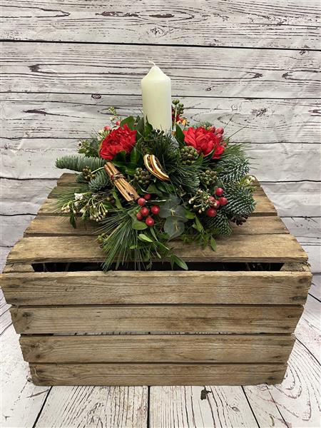 An array of scented Pines, Fruit slices and cinnamon along with long lasting flowers and a chunky candle. A wonderful addition to any table.